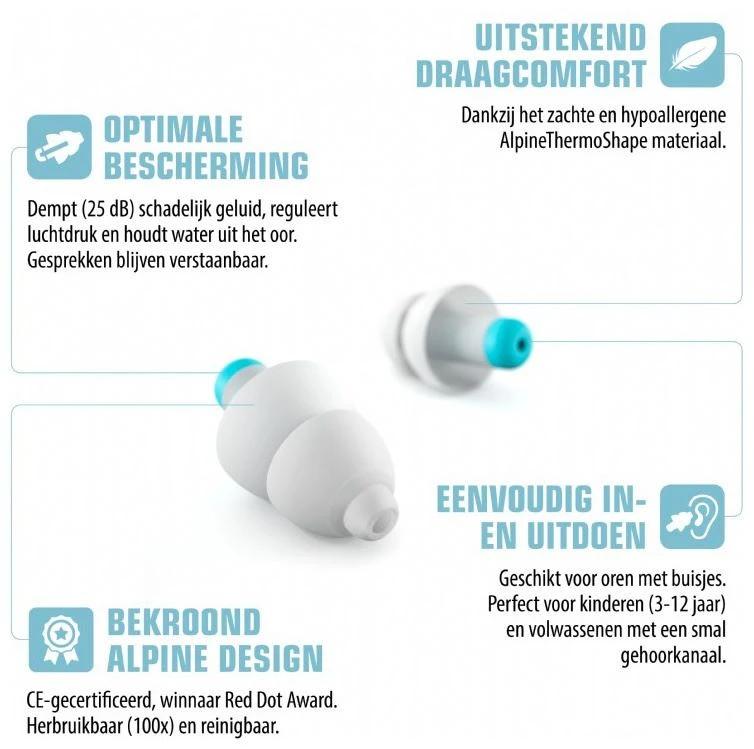 Voor volwassenen met een kleinere gehoorgang: Elk oor is anders. Sommige volwassen hebben een kleinere gehoorgang, waardoor oordoppen zoals de Alpine PartyPlug, Alpine WorkSafe, e.d. minder goed passen. In dat geval kun je ook de Alpine Pluggies Kids gebruiken voor muziek luisteren, vliegen, klussen en zwemmen. Slapen met de Alpine Pluggies Kids kan minder comfortabel zijn voor zijslapers dan de Alpine SleepSoft, aangezien de Alpine SleepSoft voorzien is van een zacht flexibel filter en de Alpine Pluggies Kids van een hard filter.