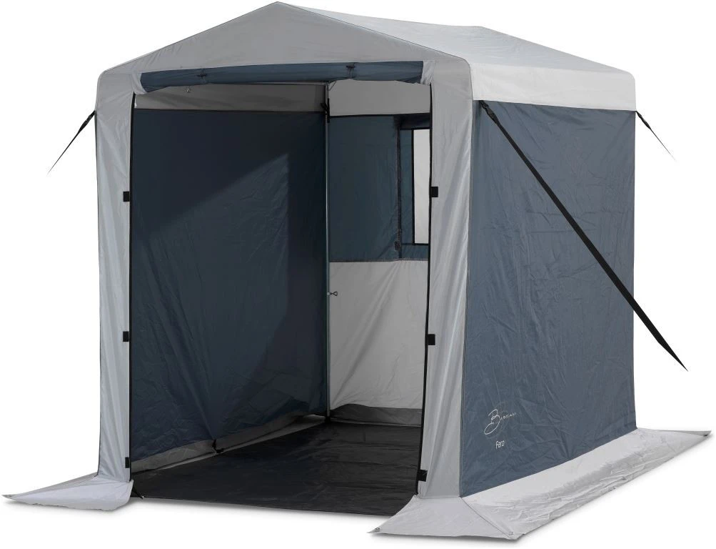 La Bardani Faro est une tente de ponçage compacte en polyester enduit PU 300D. Les murs sont EN polyester enduit PU 150D. Le Faro a un cadre en acier de 22/19 mm d’épaisseur. Les coutures sont collées, et la tente dispose de fermetures éclair extra lourdes (10 mm). Le Faro est livré avec une feuille de base en PE, et a un bord d’avalement en PVC. Le dos dispose d’un cadre de montre verrouillable, pour une ventilation supplémentaire.