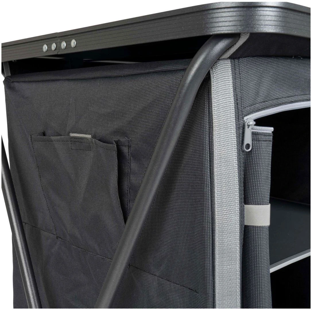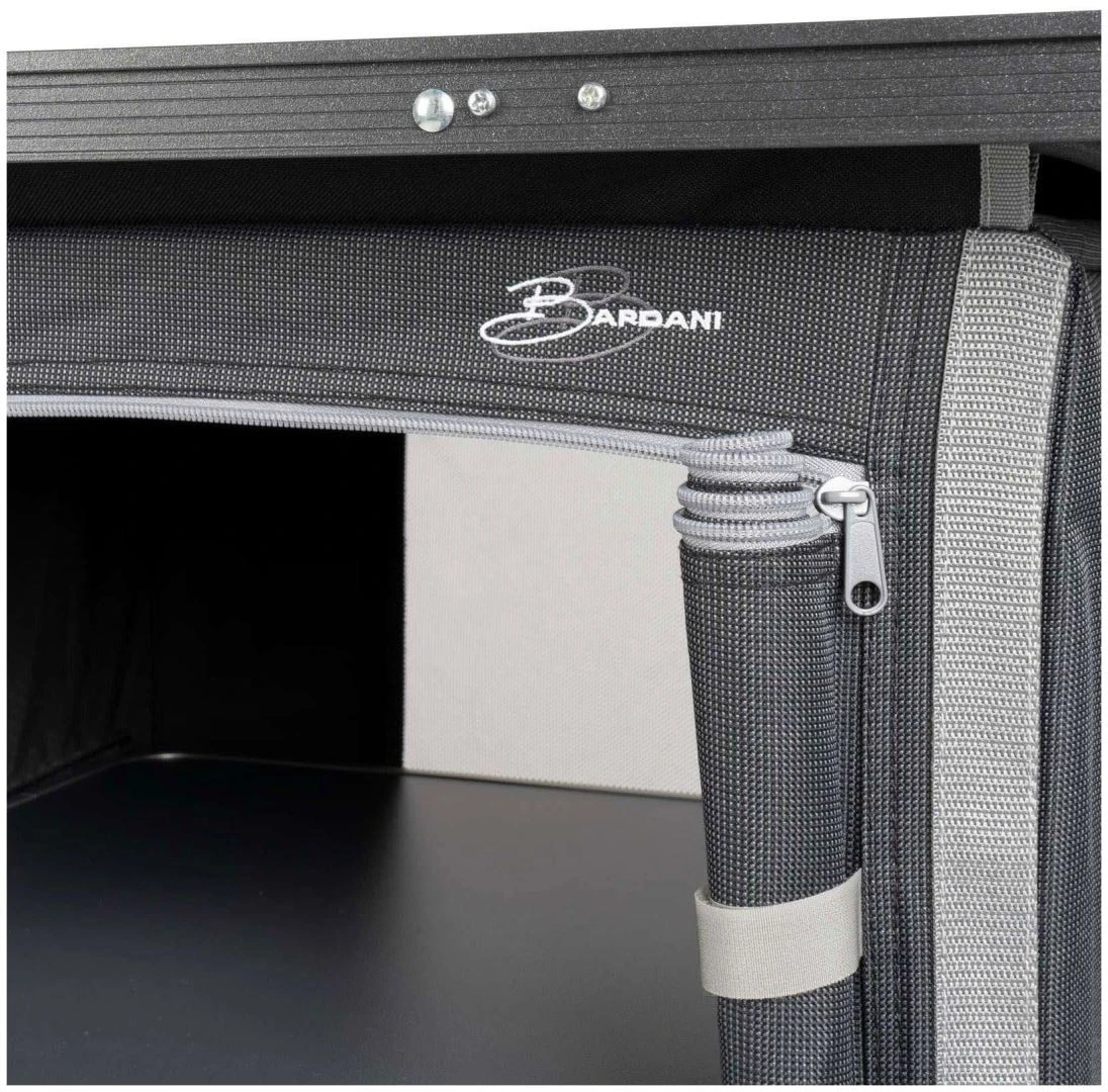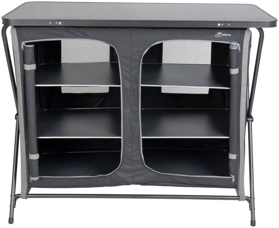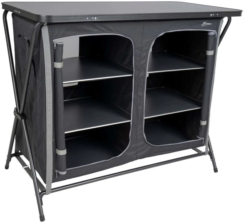 The Bardani Ripiani X6 camping cupboard is equipped with a gray 600 D polyester fabric. In addition, the Bardani camping cupboard has an aluminum frame and an MDF top. Thanks to this tray, you can put things on the cupboard in addition to things in the cupboard. The camping cupboard has a total of 6 shelves.