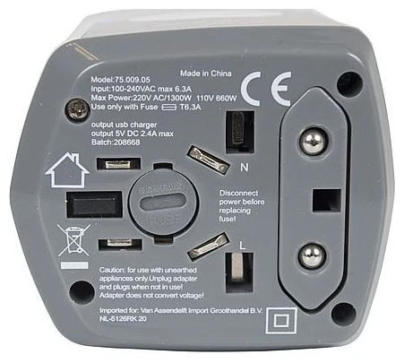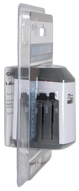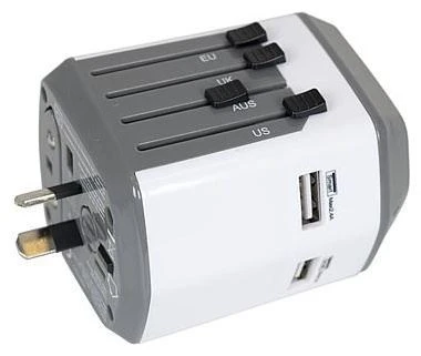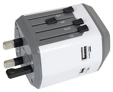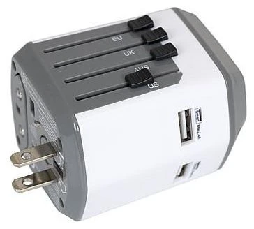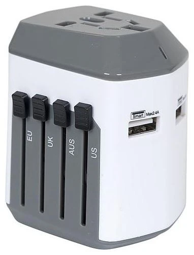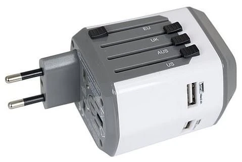 Een wereldstekker met diverse stekker aansluitingen en twee USB poorten