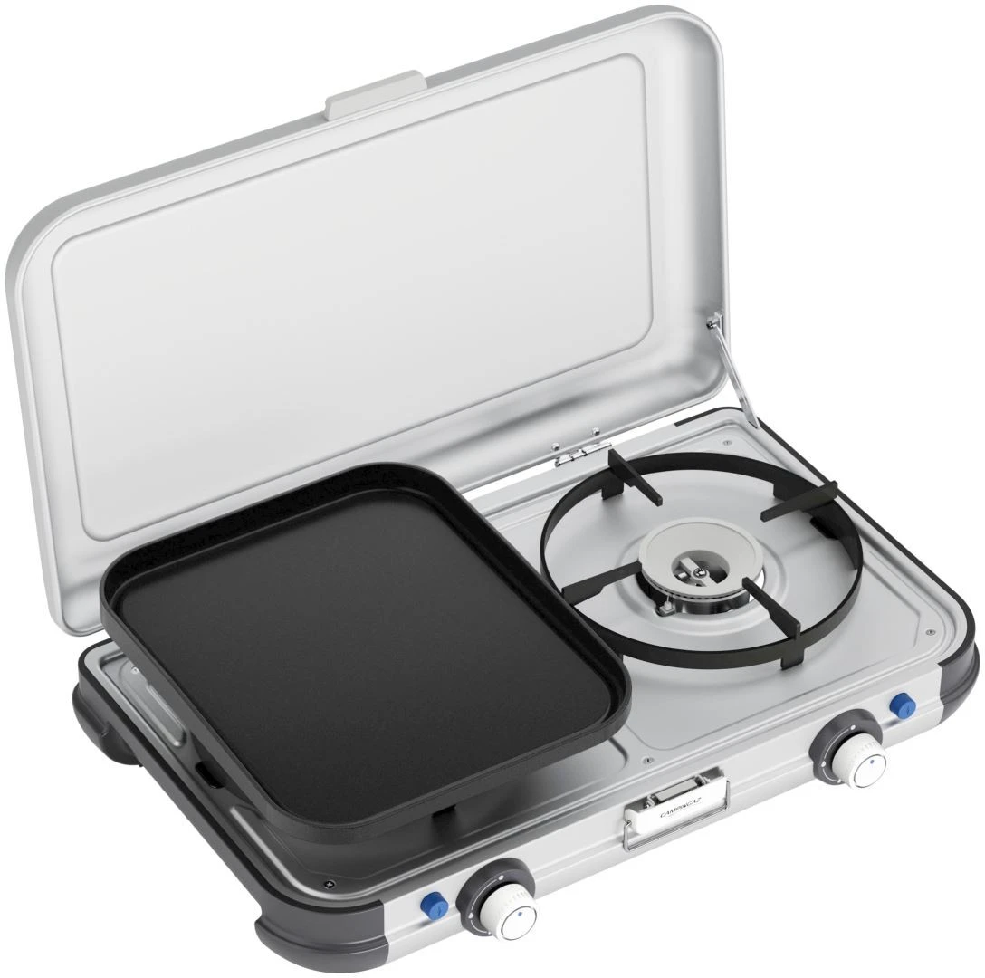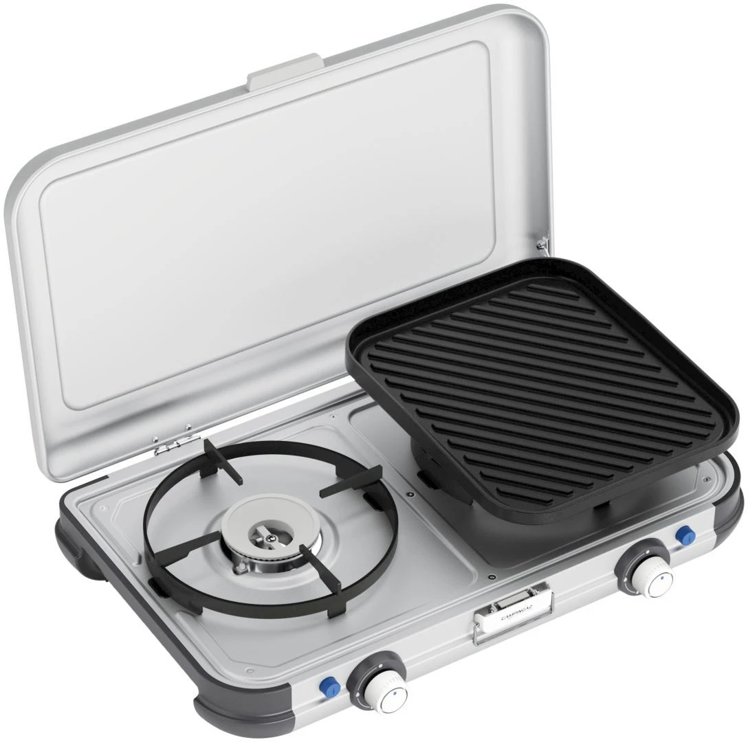 Equipped with removable and easy-to-clean grid and griddle, the new Camping stove Kitchen 2 Grill & Go is your compact and travel companion for versatile cooking. This Campingaz stove is powered by Campingaz CV cartridges for added convenience.