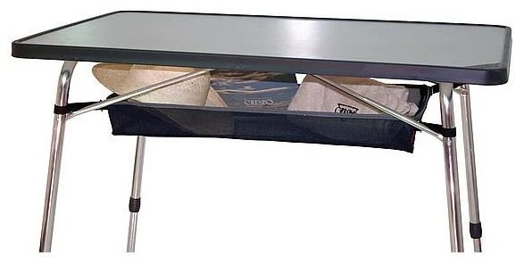 Een net voor onder het tafelblad. Ideaal voor het opbergen van kranten, tijdschriften, een telefoon of andere spullen. Perfect te combineren met Crespo tafels of universeel te gebruiken voor andere merken campingtafels door de klittenbandbevestiging.