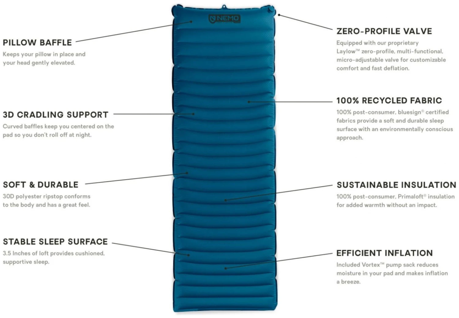 Quasar™ 3D fait un bond en avant en matière de durabilité avec notre tout premier coussin de couchage certifié bluesign®. La ripstop en polyester 30D durable est fabriquée à partir de matériaux recyclés 100 % post-consommation qui s’adaptent au corps et ont une excellente sensation. Nos valves à profil zéro et multifonctions Laylow™ personnalisées, combinées à notre sac de pompe Vortex™ inclus, vous permettent de gonfler et dégonfler rapidement et facilement pour un confort maximal.