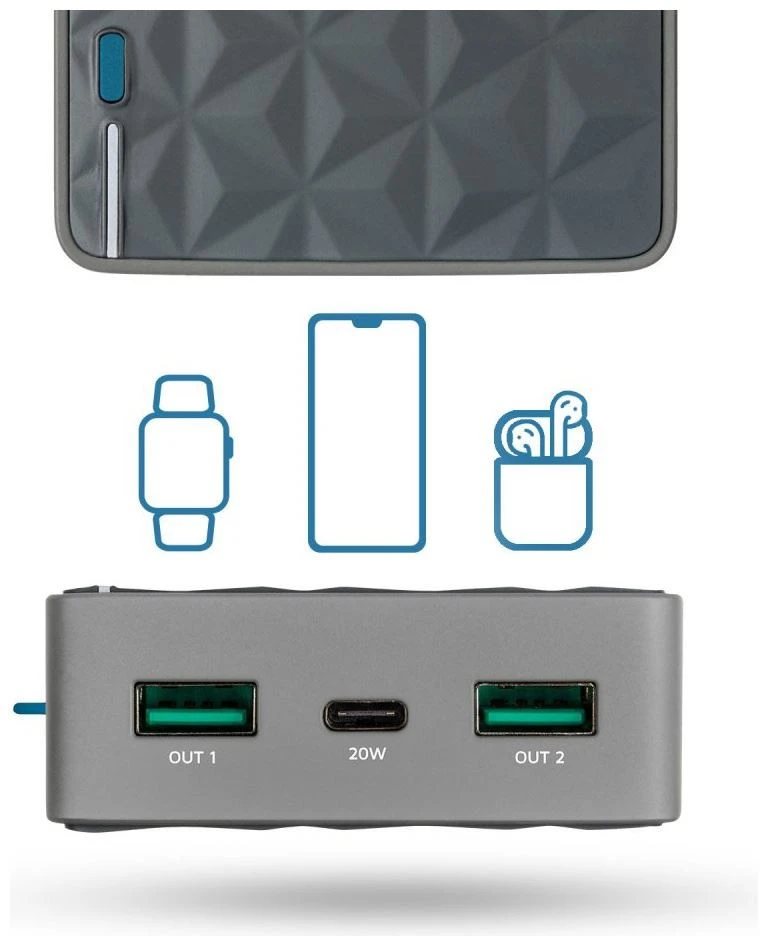 Eine kompakte und leichte Power Bank mit Ladeanzeigen. Verfügt über einen internen 20000-mAh-Akku mit ausreichend Energie, um ein Smartphone 7 bis 8 Mal vollständig aufzuladen. Mit diesem unverzichtbaren Zubehör können Geräte überall problemlos aufgeladen werden. Beispielsweise kann ein Mobiltelefon, ein Tablet, ein Navigationssystem, ein Musikplayer oder ein anderes Gerät mit zusätzlicher Energie versorgt werden.